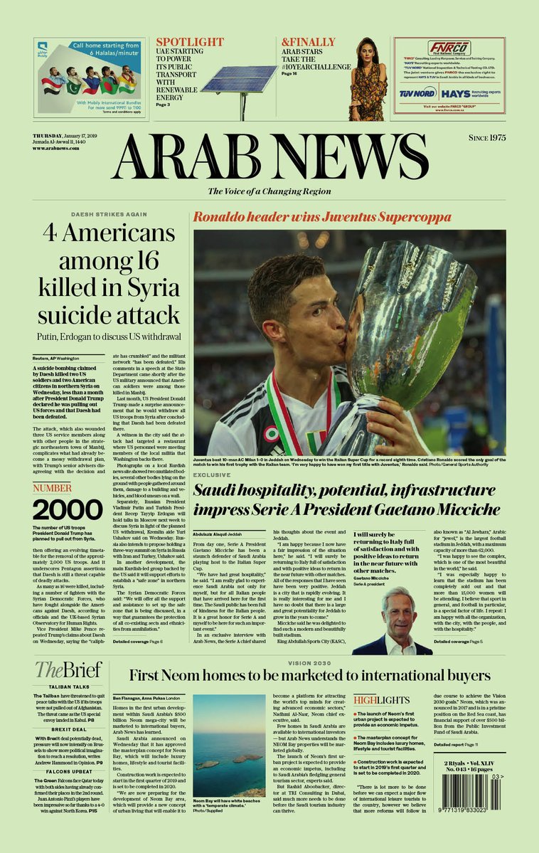 Arab news, quotidiano in lingua inglese pubblicato in Arabia Saudita, ha dedicato ampio spazio al trionfo in Supercoppa della Juventus. Nella sua prima pagina, infatti, campeggia l'immagine del match-winner, Cristiano Ronaldo, che bacia il trofeo. "Il colpo di testa di Ronaldo fa vincere la Supercoppa alla Juve", titola il quotidiano.