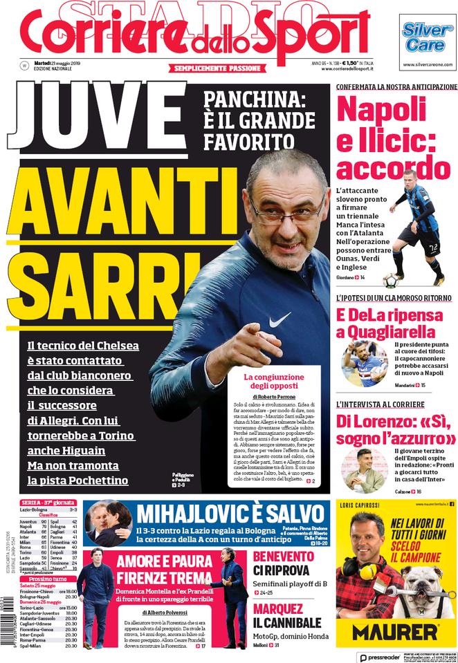 "Juve avanti Sarr", è l'apertura dell'edizione odierna del Corriere dell Sport. Panchina: è il grande favorito. Il tecnico de Chelsea è stato contattato dal club bianconero che lo considera il successore di Allegri. Con lui tornerebbe a Torino Higuain. Ma non tramonta la pista Pochettino