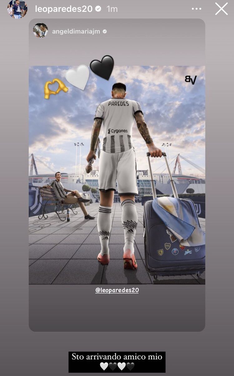 Lenadro Paredes è ufficialmente un nuovo giocatore della Juventus. A dargli il benvenuto è stato Angel Di Maria che ha pubblicato una storia sul propio account Instagram che ritrae l'ex centrocampista del PSG in partenza verso la nuova avventura bianconera. Non è tardata la risposta di Paredes, che si è dimostrato voglioso di iniziare la nuova avventura in bianconero. "Sto arrivando amico mio" le sue parole.