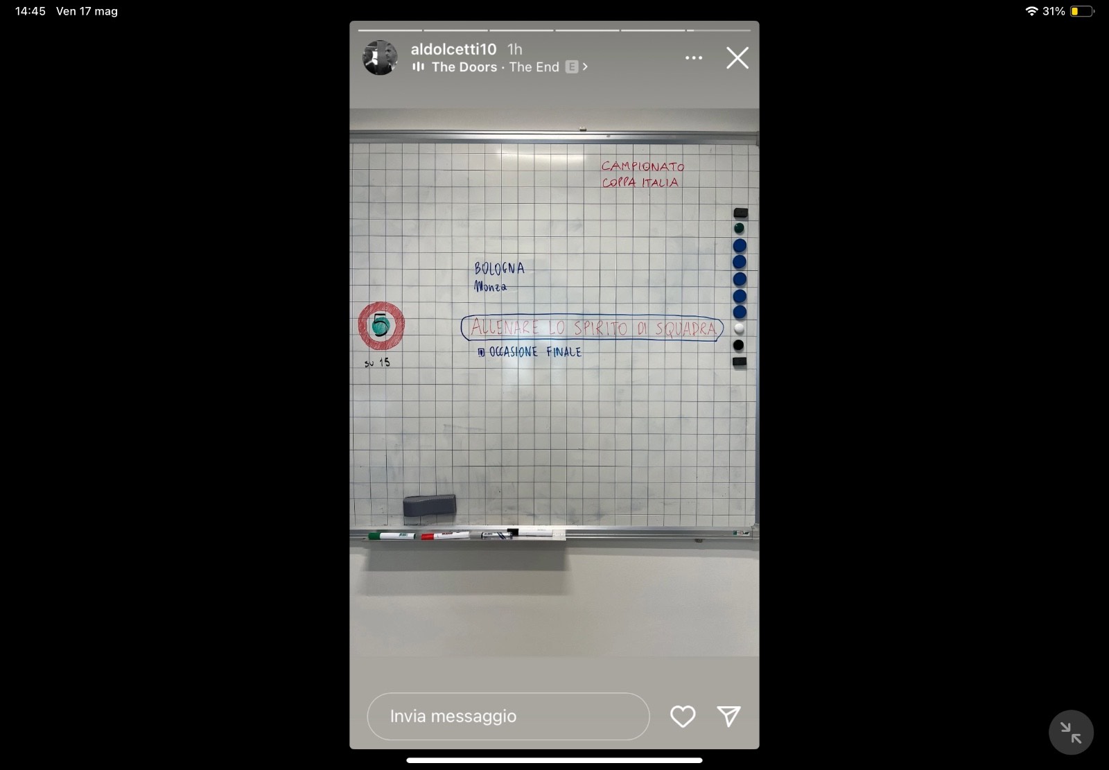 Aldo Dolcetti, collaboratore tecnico di Massimiliano Allegri, su Instagram ha postato una foto della lavagna tecnico-tattica della Juventus in vista delle prossime due ultime sfide di campionato contro Monza e Bologna. Se gli obiettivi Coppa Italia e Champions sono stati ormai conseguiti, i giocatori come scrive Dolcetti dovranno in queste ultime due gare ''allenare lo spirito di squadra", il tutto condito dalla canzone dei The Doors che si intitola The End, ovvero la fine. Un altro indizio sull'addio di Allegri che potrebbe arrivare dopo le ultime due gare della stagione?