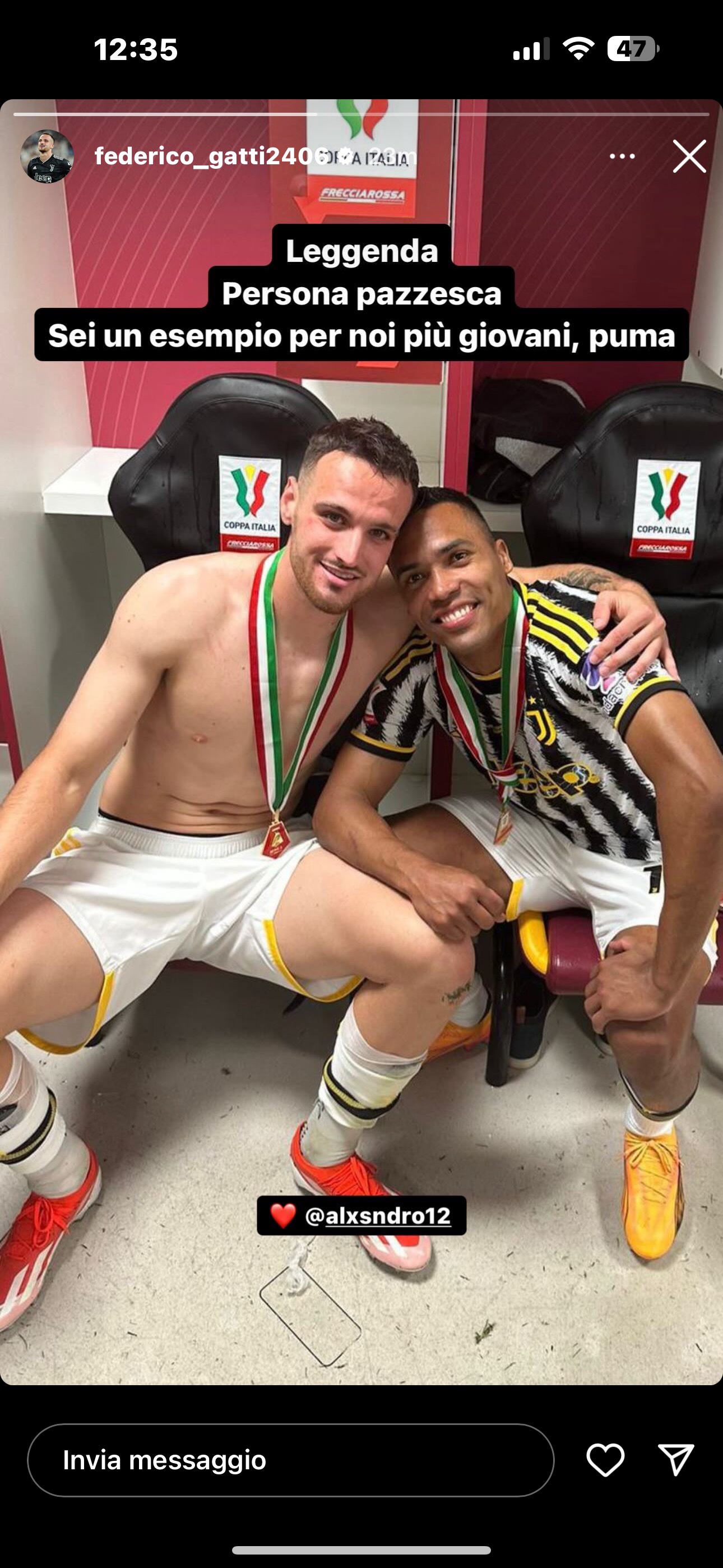 Con una storia pubblicata su Instagram, Federico Gatti ha salutato Alex Sandro che domani contro il Monza giocherà la sua ultima gara con la maglia della Juventus: "Leggenda, persona pazzesca. Un esempio per noi più giovani. Puma".