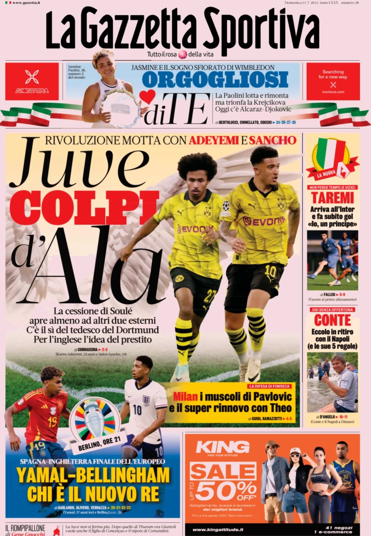 La Gazzetta dello Sport apre col mercato della Juventus: "Juve, colpi d'ala". Rivoluzione Motta con Adeyemi e Sancho. La cessione di Soulé apre almeno ad altri due esterni. C'è il sì del tedesco del Dortmund. Per l'inglese l'dea del prestito.