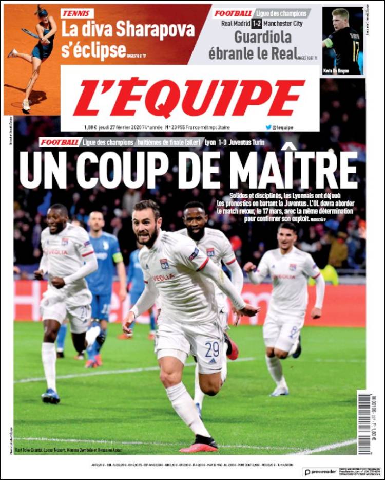 Grande entusiasmo sui quotidiani francesi per la vittoria del Lione sulla Juventus. L’edizione odierna de L’Equipe apre con il titolo “Un colpo da maestro” dopo il successo dei transalpini per 1-0 nell’andata degli ottavi di finale di Champions League: "Solidi e disciplinati - scrive il quotidiano - gli uomini del Lione ribaltano il pronostico e battono la Juventus. L'OL dovrà affrontare il match di ritorno, il 17 marzo, con la stessa determinazione per confermare il suo exploit".