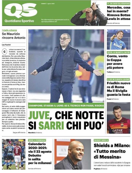 Il QS stamattina titola: "Juve, che notte. Si Sarri chi può". Stasera il Lione: se il tecnico non passa, rischia. Ronaldo all'assalto dei francesi per ribaltare l'1-0 e centrare i quarti di finale. Dybala in dubbio, probabile chance per Gonzalo Higuain.