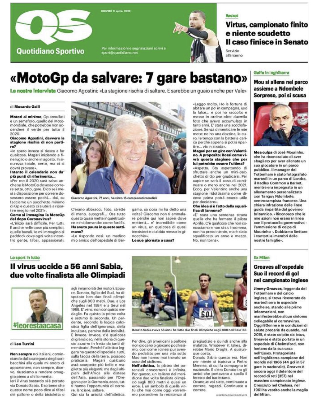 "Mou si allena nel parco assieme a Ndombele. Sorpreso poi si scusa". Questo il titolo in taglio laterale sulla prima pagina del QS in edicola stamani sulla gaffe in Inghilterra che ha visto come protagonista Joè Mourinho. L'allenatore del Tottenham è stato sorpreso in un parco ad allenare tre giocatori. Subito dopo ha riconosciuto di aver sbagliato.