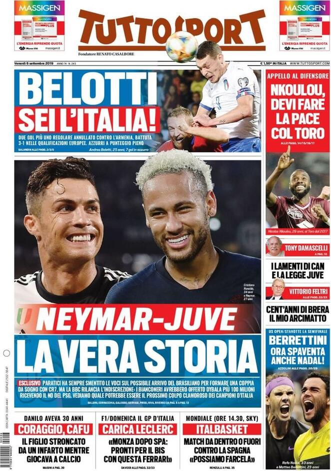 "Neymar-Juve, la vera storia", è l'apertura di Tuttosport. Esclusivo. Paratici ha sempre smentito le voci sul possibile arrivo del brasiliano per formare una coppia da sogno con CR7. Ma la BBC rilancia l'indiscrezione: i bianconeri avrebbero offerto Dybala più 100 milioni, ricevendo il no del PSG. Vediamo quale potrebbe essere il prossimo colpo clamoroso dei Campioni d'Italia.