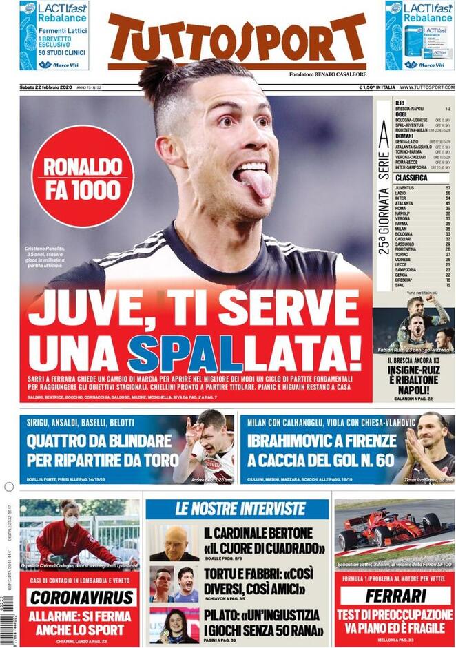 " Juve, ti serve una spallata!". Così apre l'edizione odierna di Tuttosport. Sarri a Ferrara chiede un cambio di marcia per aprire nel migliore dei modi un ciclo di partite fondamentali per raggiungere gli obiettivi stagionali. Chiellini pronta a partire titolare. Pjanic e Higuain restano a casa. Ronaldo fa 1000.