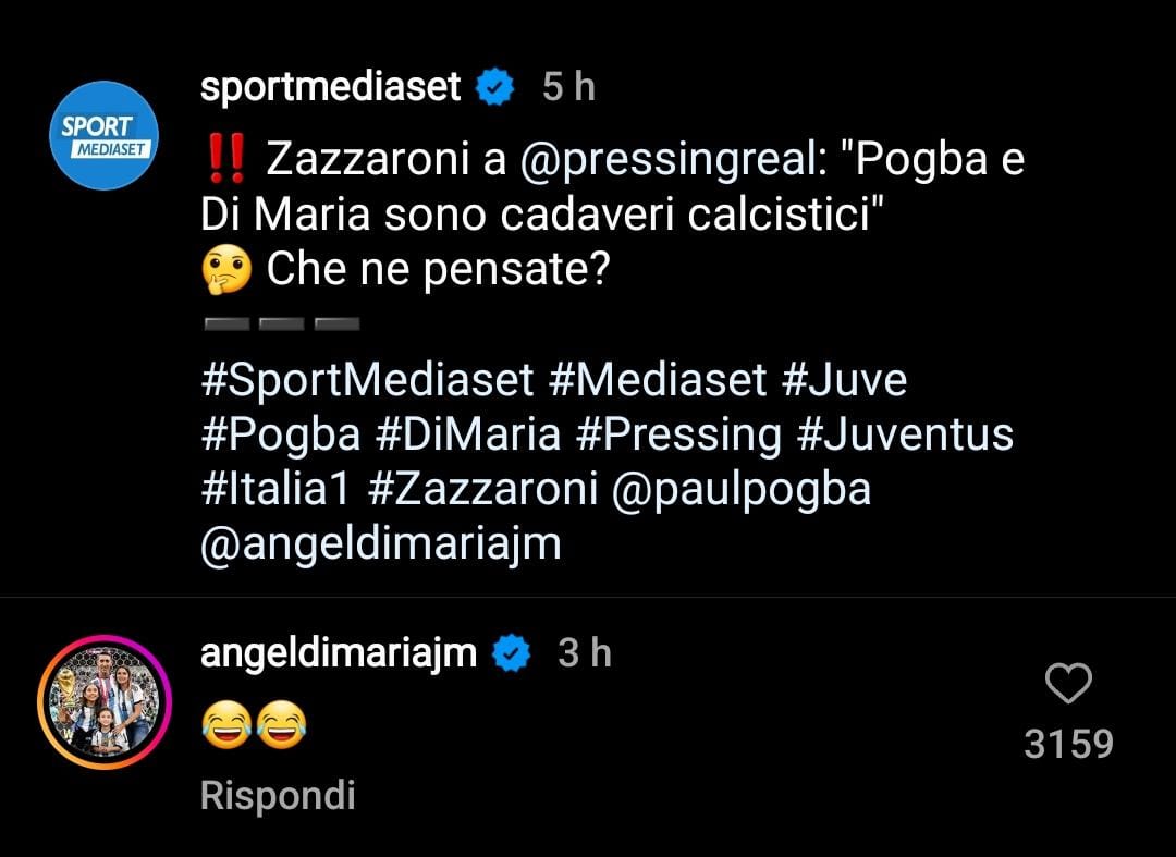"Pogba e Di Maria sono due cadaveri calcistici". Queste le parole pronunciate ieri dal giornalista Ivan Zazzaroni nel corso di 'Pressing'. Oggi è arrivata su Instagram la replica del Fideo, che ha commentato l'estratto video con una doppia faccina che ride. L'esterno argentino contro l'Hellas Verona è entrato in campo al 15' della ripresa al posto di Milik.