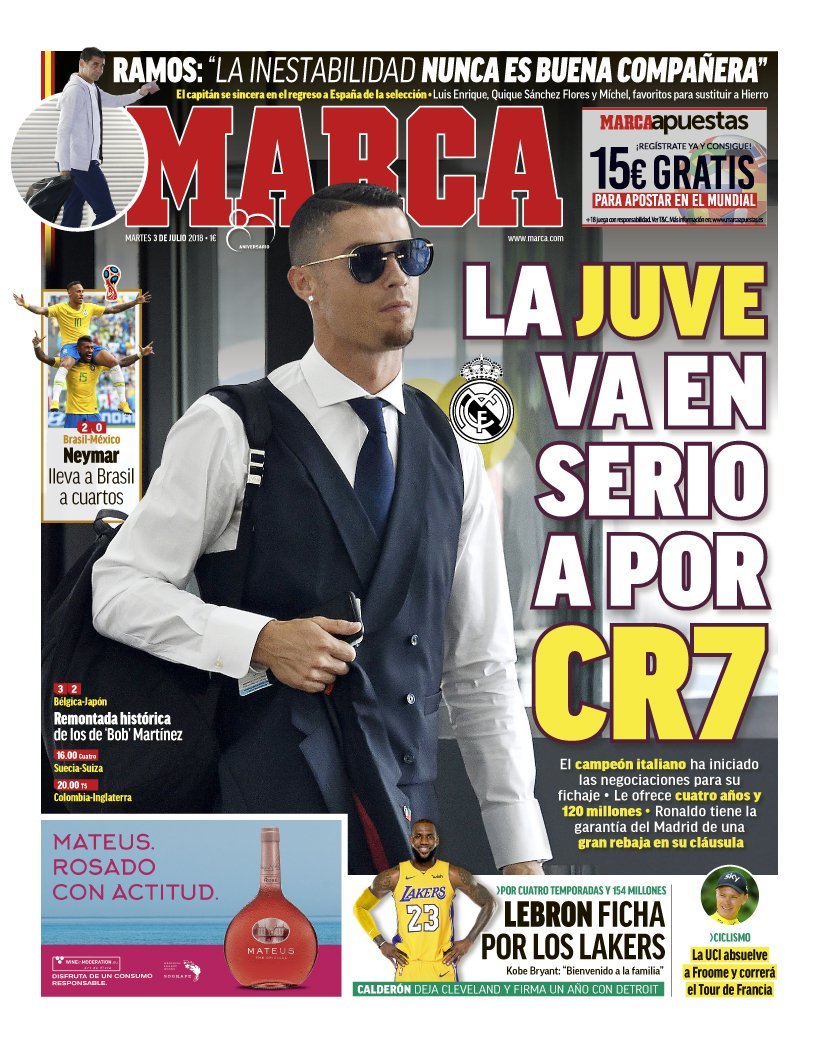 Marca conferma l'assalto della Juventus a Cristiano Ronaldo: "La Juve fa sul serio per CR7", la rumorosa apertura del quotidiano spagnolo. I campioni d'Italia hanno iniziato le trattative per il suo trasferimento. Offrono quattro anni e 120 milioni. Ronaldo ha la garanzia da parte del Real Madrid di una grande riduzione della sua clausola. Questa la clamorosa indiscrezione che spara Marca in prima pagina e che fa sognare i tifosi bianconeri.